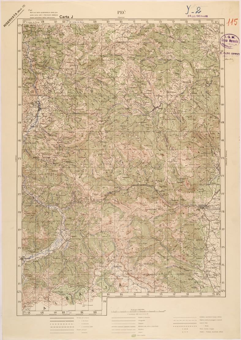 "Carta compilata dalla divisione cartografica dell' IGM dal Settembre 1939 ad Aprile 1940 con aggiornamenti del 1941 per viabilità e toponomastica, gli originali furono ricavati dal ridisegno della carta Jugoslava alla stessa scala traducendo i toponimi originali, in parte Latini in parte Cirillici. Lavoro ordinato dal Comando di Stato Maggiore per le Forze Armate operanti nella zona."