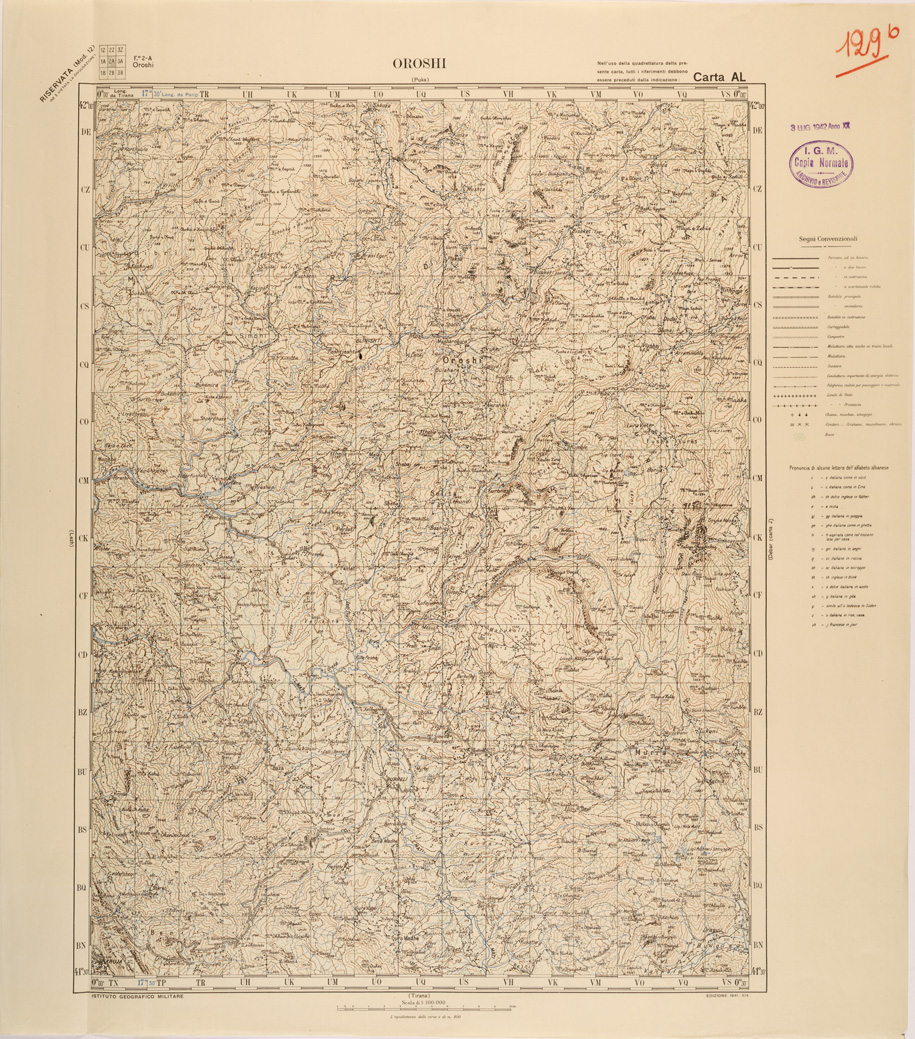 "Carta compilata dalla divisione cartografica dell' IGM dal Settembre 1939 ad Aprile 1940 con aggiornamenti del 1941 per viabilità e toponomastica, gli originali furono ricavati dal ridisegno della carta Jugoslava alla stessa scala traducendo i toponimi originali, in parte Latini in parte Cirillici. Lavoro ordinato dal Comando di Stato Maggiore per le Forze Armate operanti nella zona."
