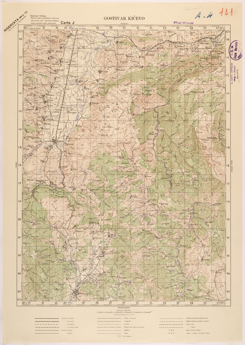 "Carta compilata dalla divisione cartografica dell' IGM dal Settembre 1939 ad Aprile 1940 con aggiornamenti del 1941 per viabilità e toponomastica, gli originali furono ricavati dal ridisegno della carta Jugoslava alla stessa scala traducendo i toponimi originali, in parte Latini in parte Cirillici. Lavoro ordinato dal Comando di Stato Maggiore per le Forze Armate operanti nella zona."