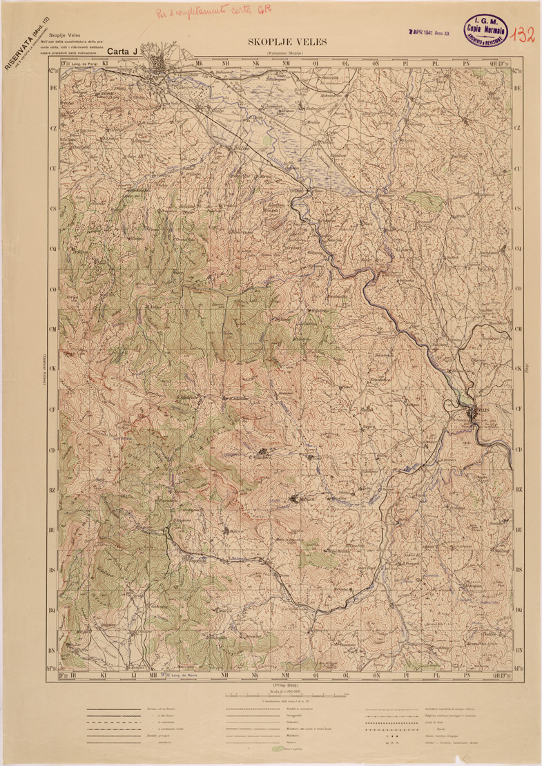 "Carta compilata dalla divisione cartografica dell' IGM dal Settembre 1939 ad Aprile 1940 con aggiornamenti del 1941 per viabilità e toponomastica, gli originali furono ricavati dal ridisegno della carta Jugoslava alla stessa scala traducendo i toponimi originali, in parte Latini in parte Cirillici. Lavoro ordinato dal Comando di Stato Maggiore per le Forze Armate operanti nella zona."