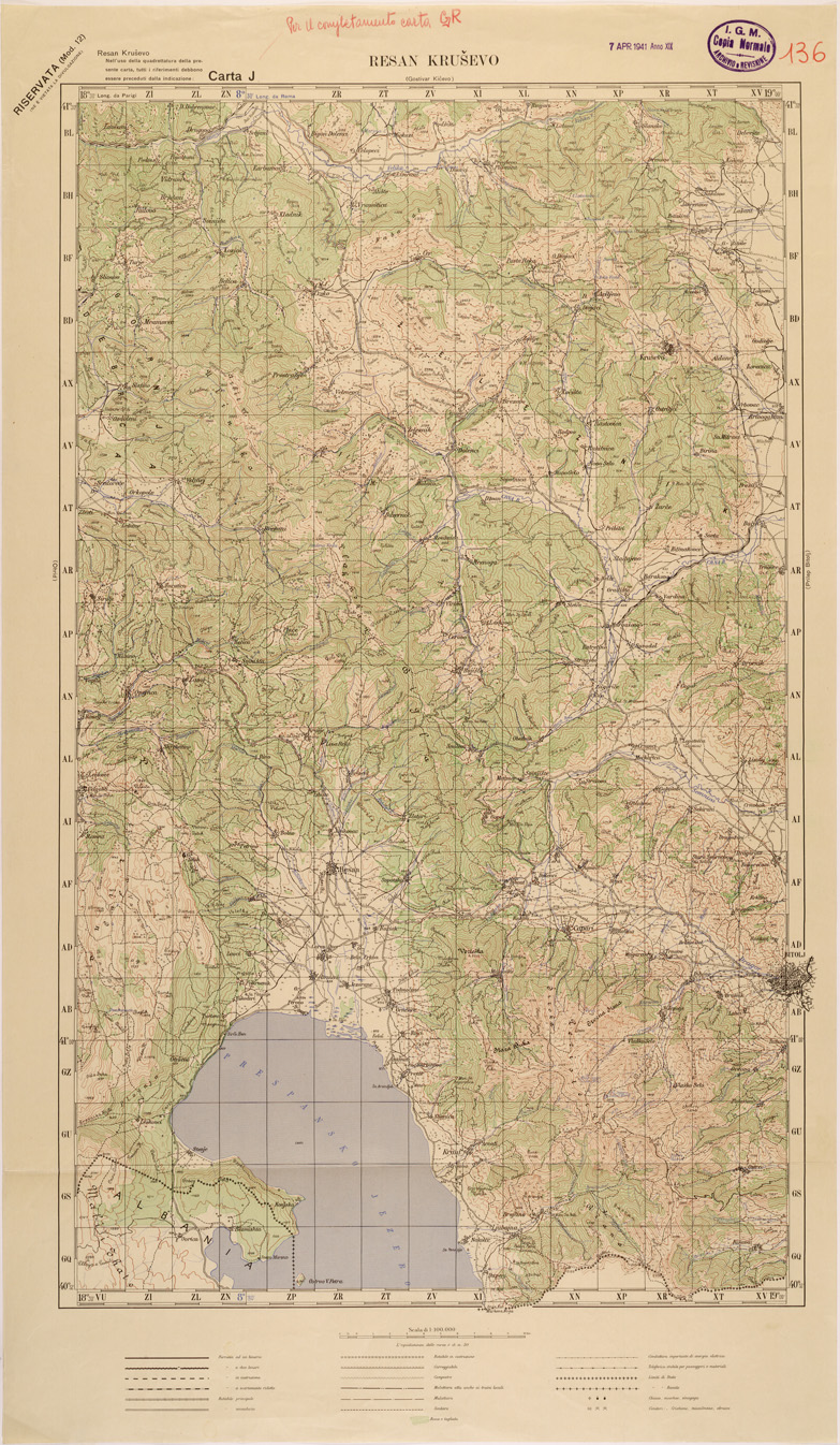 "Carta compilata dalla divisione cartografica dell' IGM dal Settembre 1939 ad Aprile 1940 con aggiornamenti del 1941 per viabilità e toponomastica, gli originali furono ricavati dal ridisegno della carta Jugoslava alla stessa scala traducendo i toponimi originali, in parte Latini in parte Cirillici. Lavoro ordinato dal Comando di Stato Maggiore per le Forze Armate operanti nella zona."