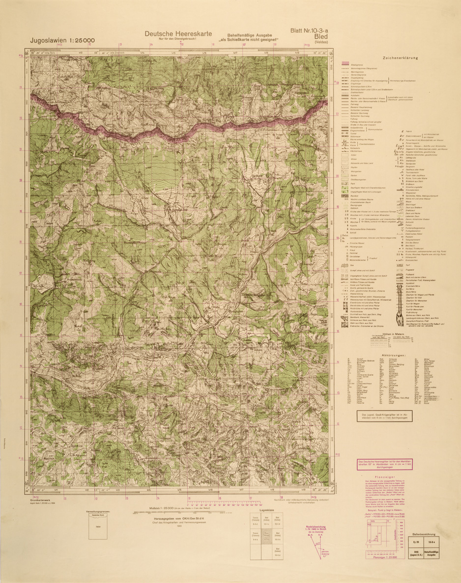 "Riproduzione allestita nel 1943 dall' Istituto Geografico Tedesco di analoga carta Jugoslava rilevata negli anni dal 1934 al 1937"