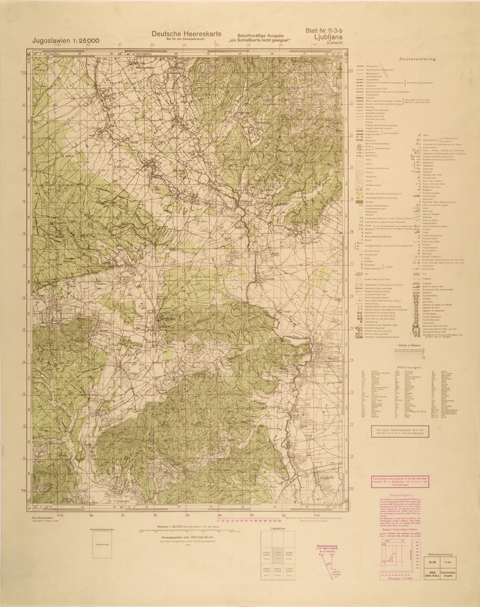 "Riproduzione allestita nel 1943 dall' Istituto Geografico Tedesco di analoga carta Jugoslava rilevata negli anni dal 1934 al 1937"