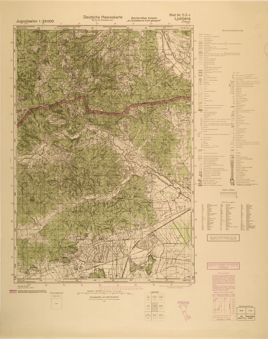 "Riproduzione allestita nel 1943 dall' Istituto Geografico Tedesco di analoga carta Jugoslava rilevata negli anni dal 1934 al 1937"