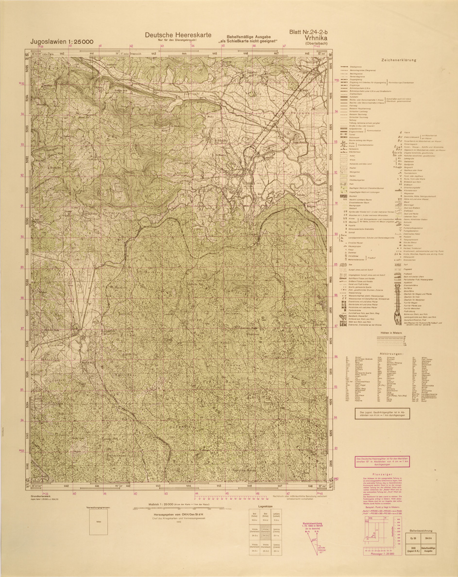 "Riproduzione allestita nel 1943 dall' Istituto Geografico Tedesco di analoga carta Jugoslava rilevata negli anni dal 1934 al 1937"