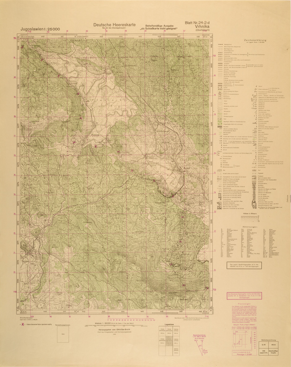 "Riproduzione allestita nel 1943 dall' Istituto Geografico Tedesco di analoga carta Jugoslava rilevata negli anni dal 1934 al 1937"