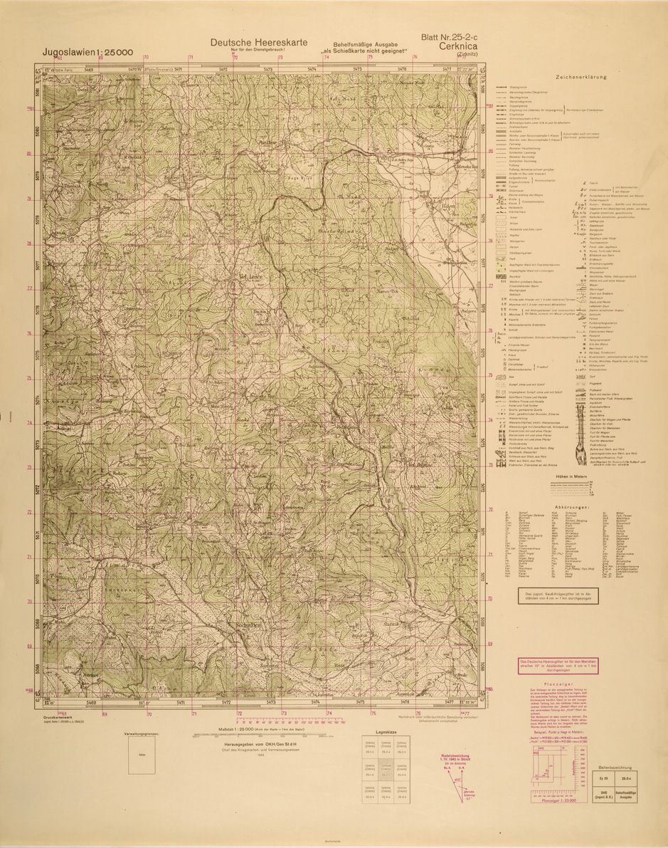 "Riproduzione allestita nel 1943 dall' Istituto Geografico Tedesco di analoga carta Jugoslava rilevata negli anni dal 1934 al 1937"