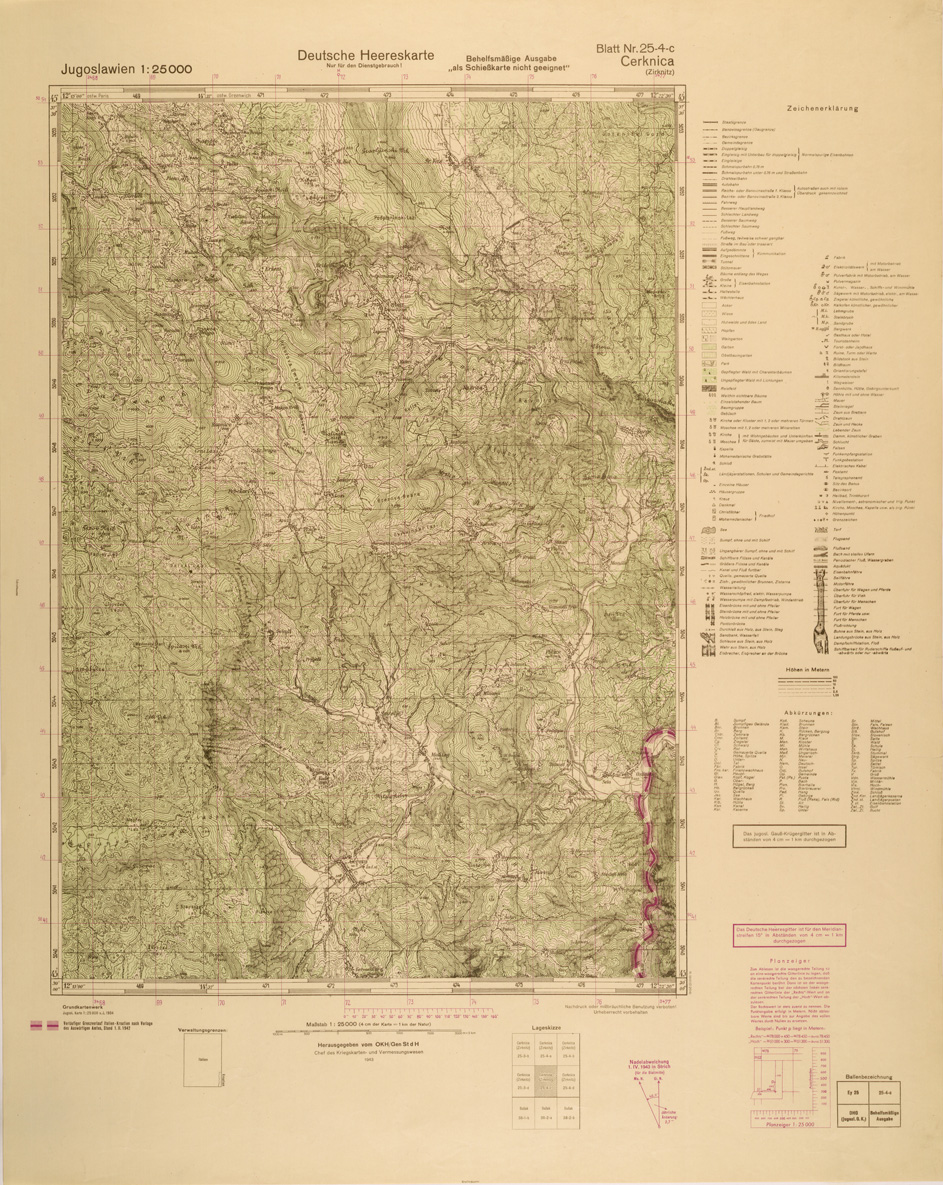 "Riproduzione allestita nel 1943 dall' Istituto Geografico Tedesco di analoga carta Jugoslava rilevata negli anni dal 1934 al 1937"
