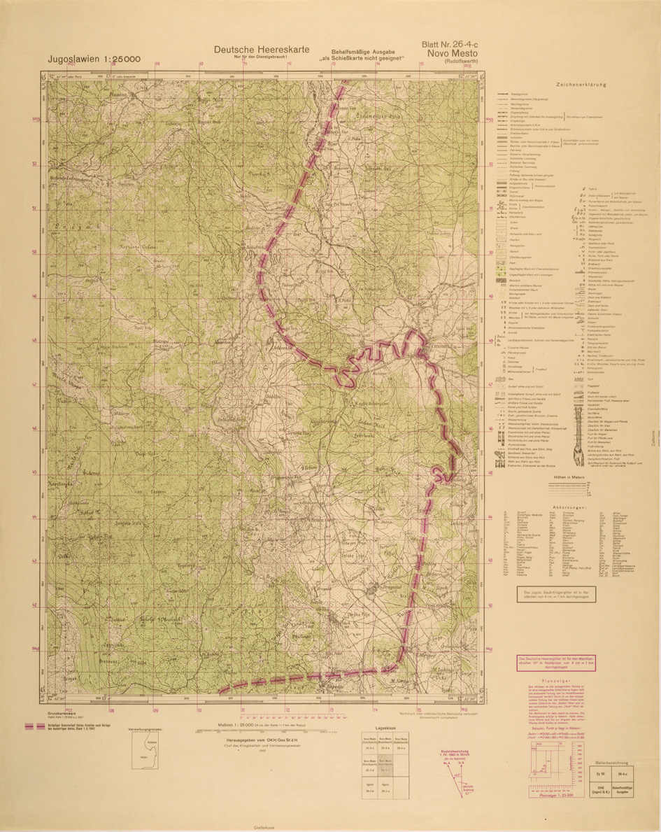 "Riproduzione allestita nel 1943 dall' Istituto Geografico Tedesco di analoga carta Jugoslava rilevata negli anni dal 1934 al 1937"