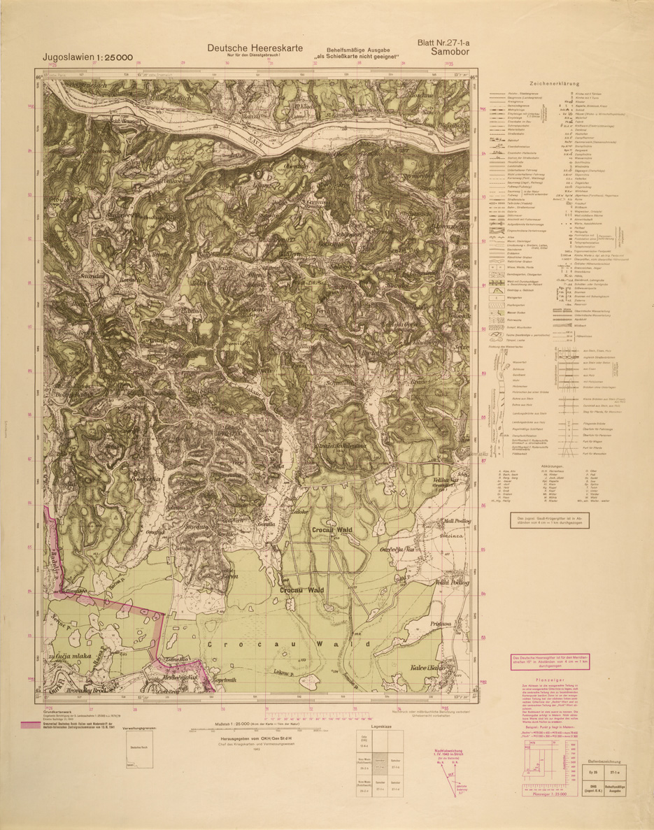 "Riproduzione allestita nel 1943 dall' Istituto Geografico Tedesco di analoga carta Jugoslava rilevata negli anni dal 1934 al 1937"