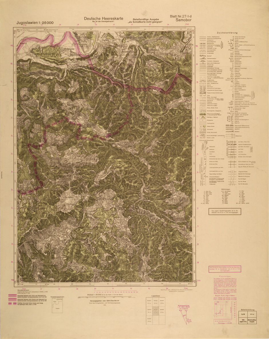 "Riproduzione allestita nel 1943 dall' Istituto Geografico Tedesco di analoga carta Jugoslava rilevata negli anni dal 1934 al 1937"