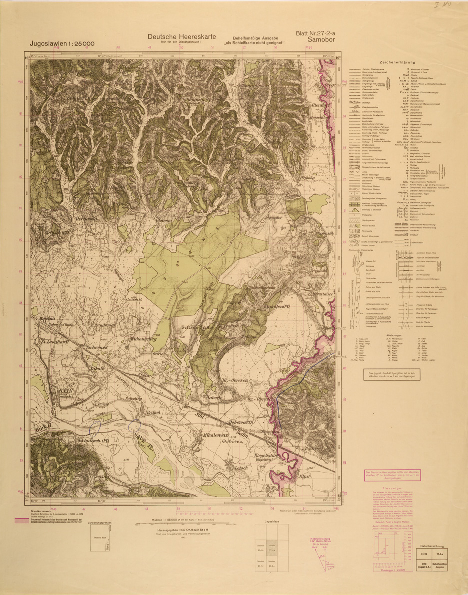 "Riproduzione allestita nel 1943 dall' Istituto Geografico Tedesco di analoga carta Jugoslava rilevata negli anni dal 1934 al 1937"