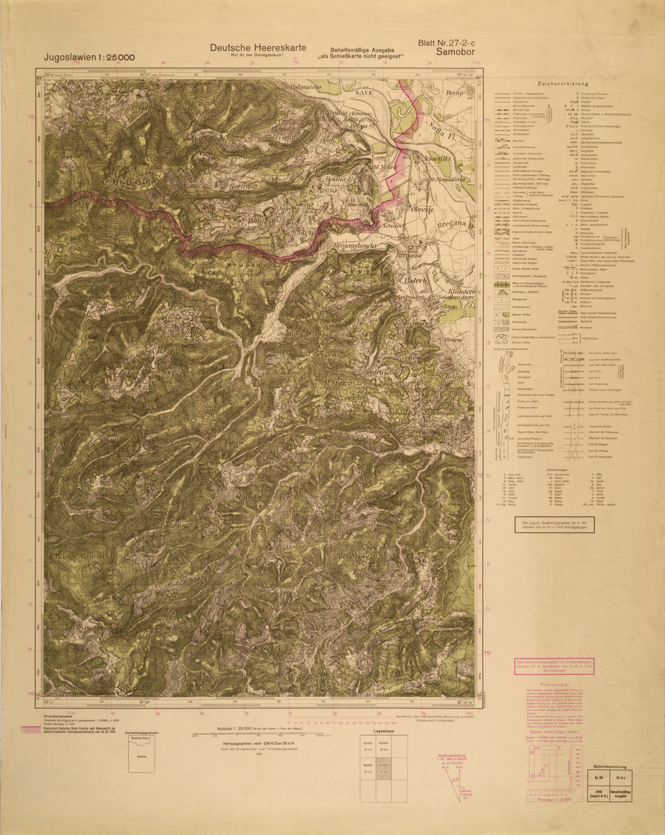 "Riproduzione allestita nel 1943 dall' Istituto Geografico Tedesco di analoga carta Jugoslava rilevata negli anni dal 1934 al 1937"
