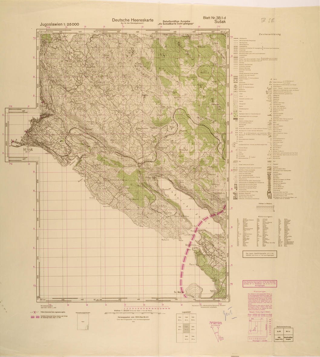"Riproduzione allestita nel 1943 dall' Istituto Geografico Tedesco di analoga carta Jugoslava rilevata negli anni dal 1934 al 1937"