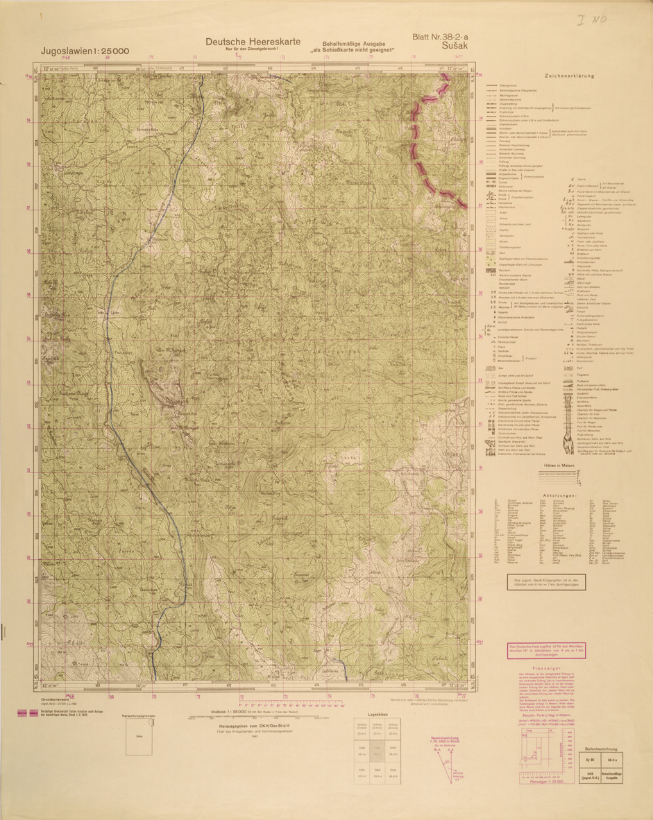 "Riproduzione allestita nel 1943 dall' Istituto Geografico Tedesco di analoga carta Jugoslava rilevata negli anni dal 1934 al 1937"
