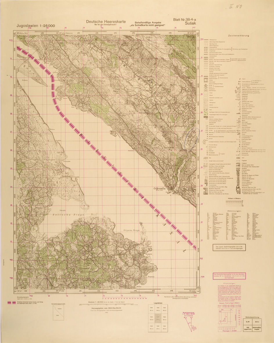 "Riproduzione allestita nel 1943 dall' Istituto Geografico Tedesco di analoga carta Jugoslava rilevata negli anni dal 1934 al 1937"