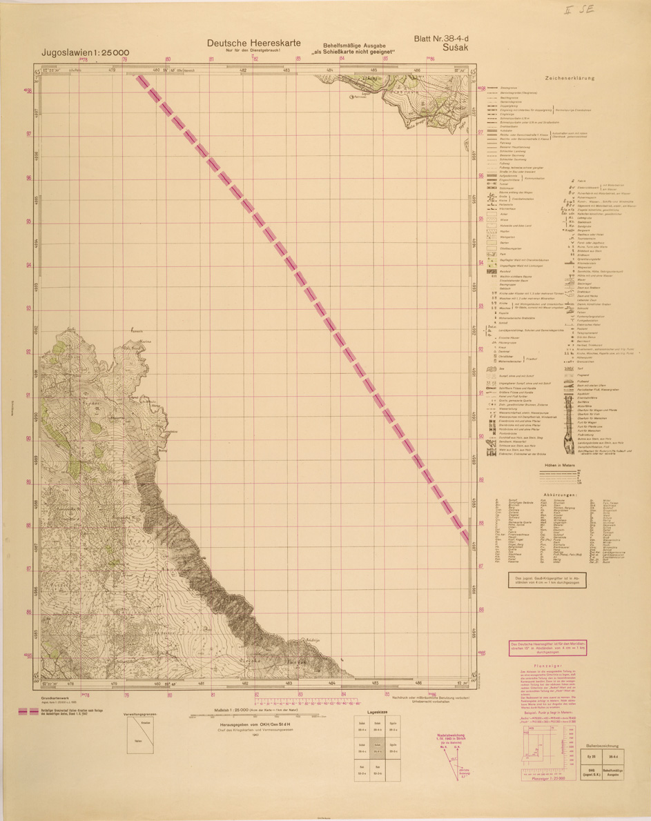 "Riproduzione allestita nel 1943 dall' Istituto Geografico Tedesco di analoga carta Jugoslava rilevata negli anni dal 1934 al 1937"