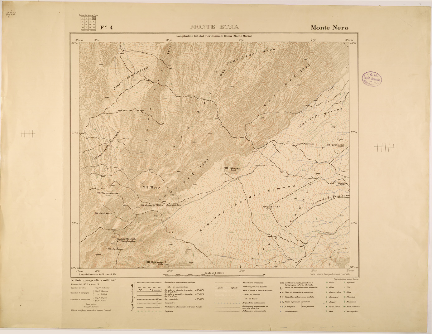 "Carta realizzata dall' IGM con gli scopi, oltre al normale fine cartografico, di testare l' allora recente procedimento di rilievo aerofotogrammetrico in un settore particolarmente impegnativo e aderire alla richiesta dell' Università di Catania e dell' Osservatorio Etneo di una carta dettagliata del Vulcano."