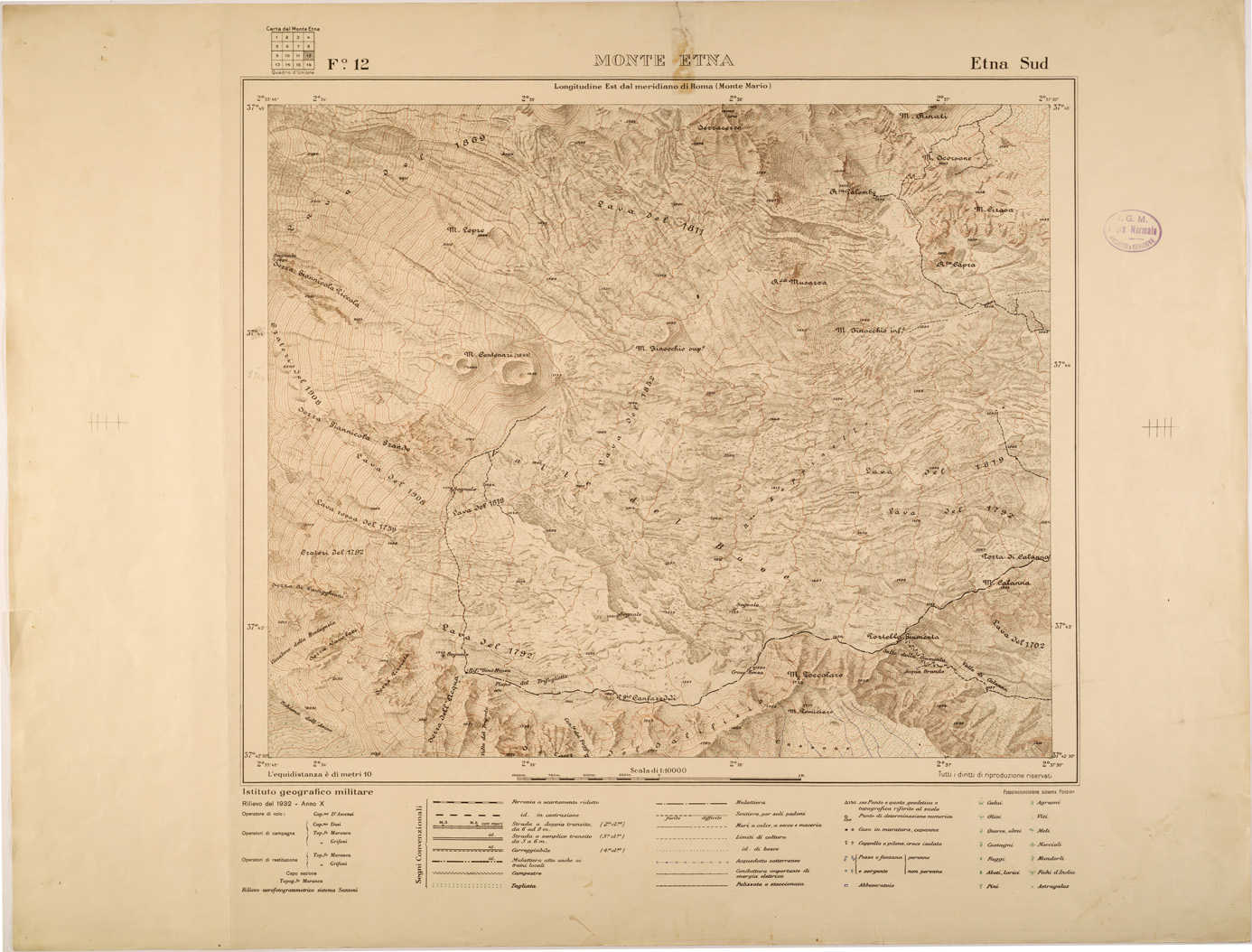 "Carta realizzata dall' IGM con gli scopi, oltre al normale fine cartografico, di testare l' allora recente procedimento di rilievo aerofotogrammetrico in un settore particolarmente impegnativo e aderire alla richiesta dell' Università di Catania e dell' Osservatorio Etneo di una carta dettagliata del Vulcano."