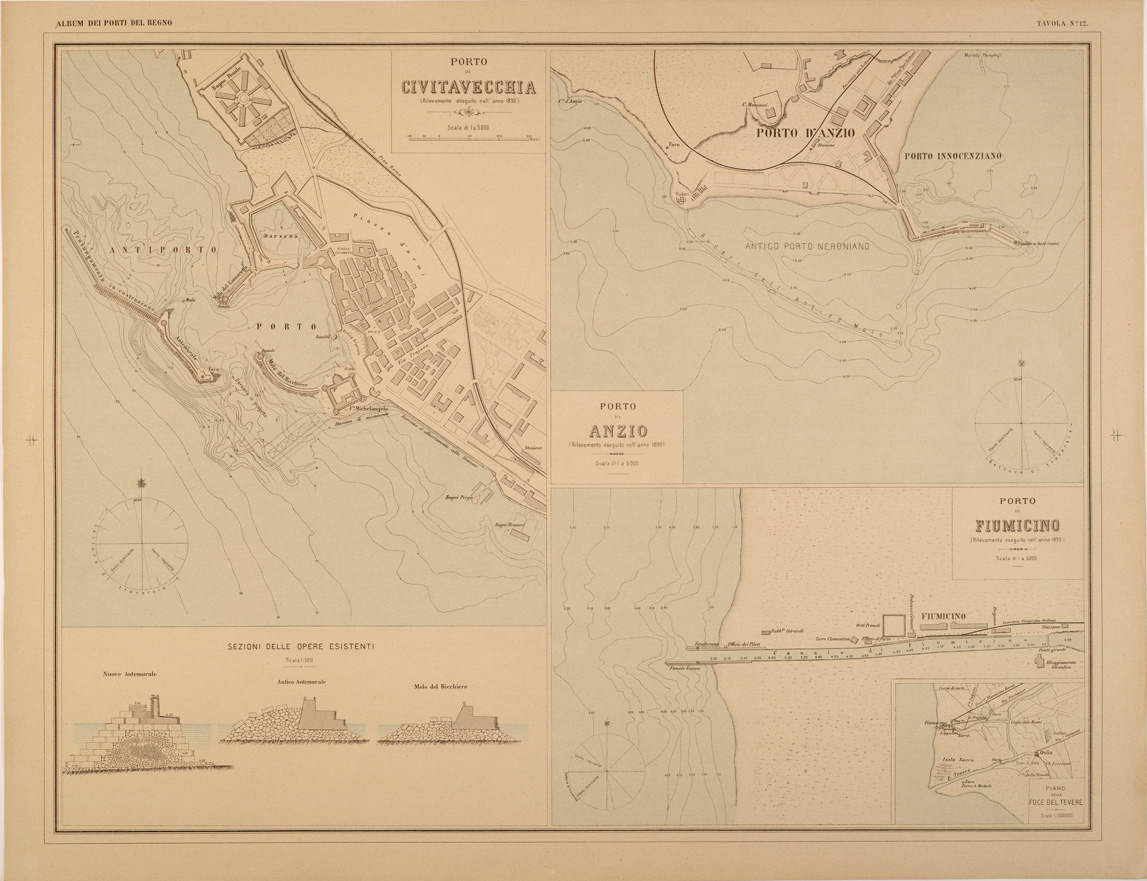 ALBUM DEI PORTI MARITTIMI DEL REGNO D'ITALIA - TAVOLA 12 - PORTI DI CIVITAVECCHIA - ANZIO - FIUMICINO