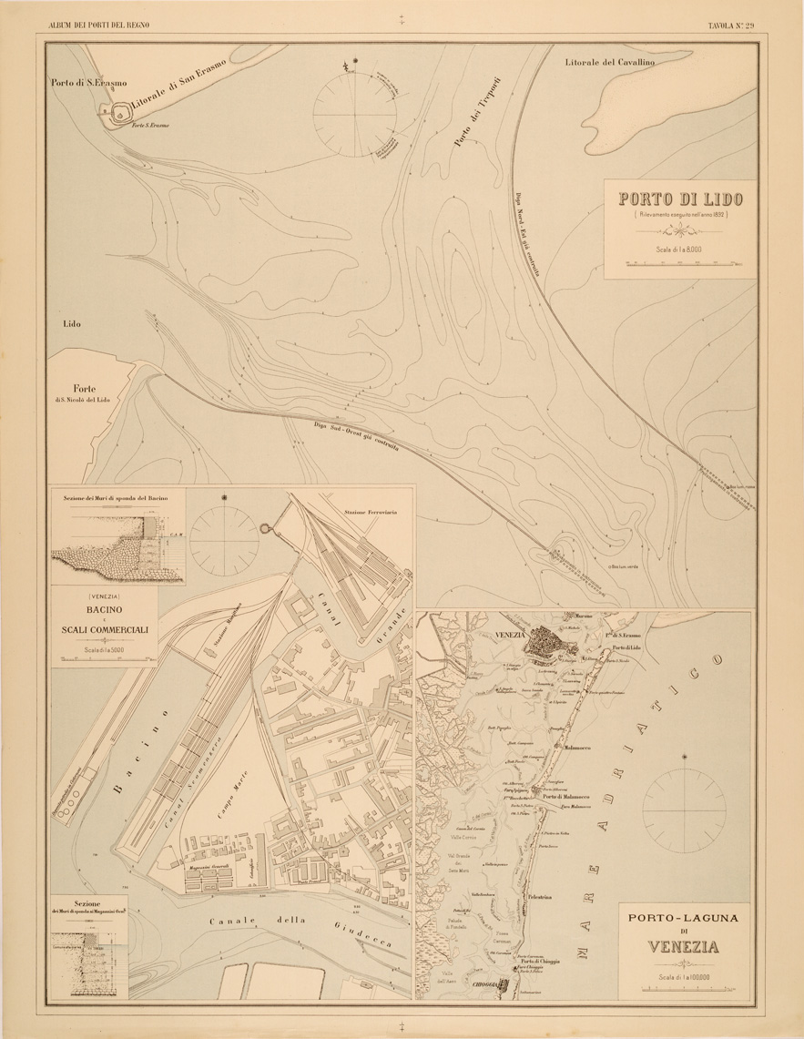 ALBUM DEI PORTI MARITTIMI DEL REGNO D'ITALIA - TAVOLA 29 - PORTO DI LIDO - BACINO E SCALI COMMERCIALI DI VENEZIA - PORTO LAGUNA DI VENEZIA