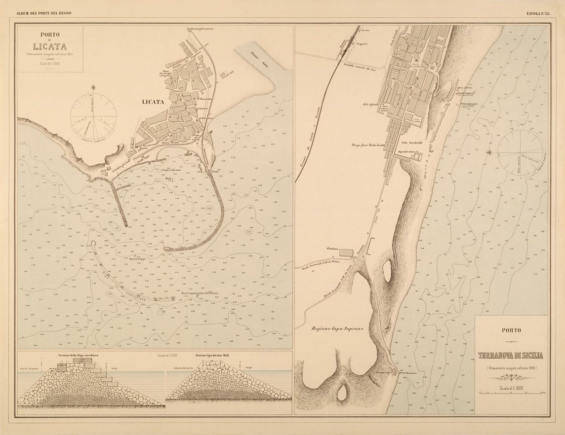ALBUM DEI PORTI MARITTIMI DEL REGNO D'ITALIA - TAVOLA 35 - PORTI DI LICATA - TERRANOVA DI SICILIA