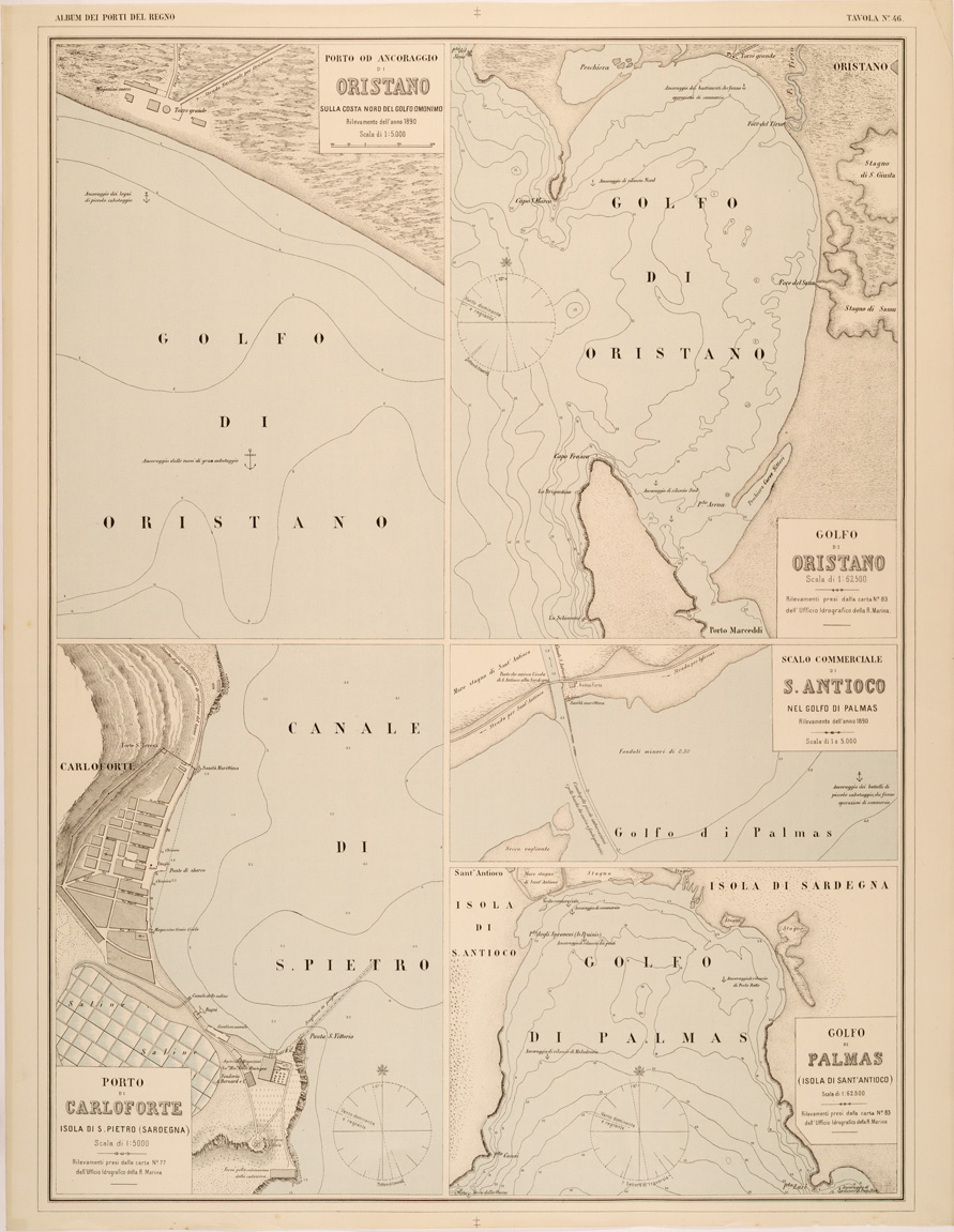 ALBUM DEI PORTI MARITTIMI DEL REGNO D'ITALIA - TAVOLA 46 - PORTI DI ORISTANO - CARLOFORTE - GOLFI DI ORISTANO - PALMAS - SCALO COMMERCIALE DI S. ANTIOCO