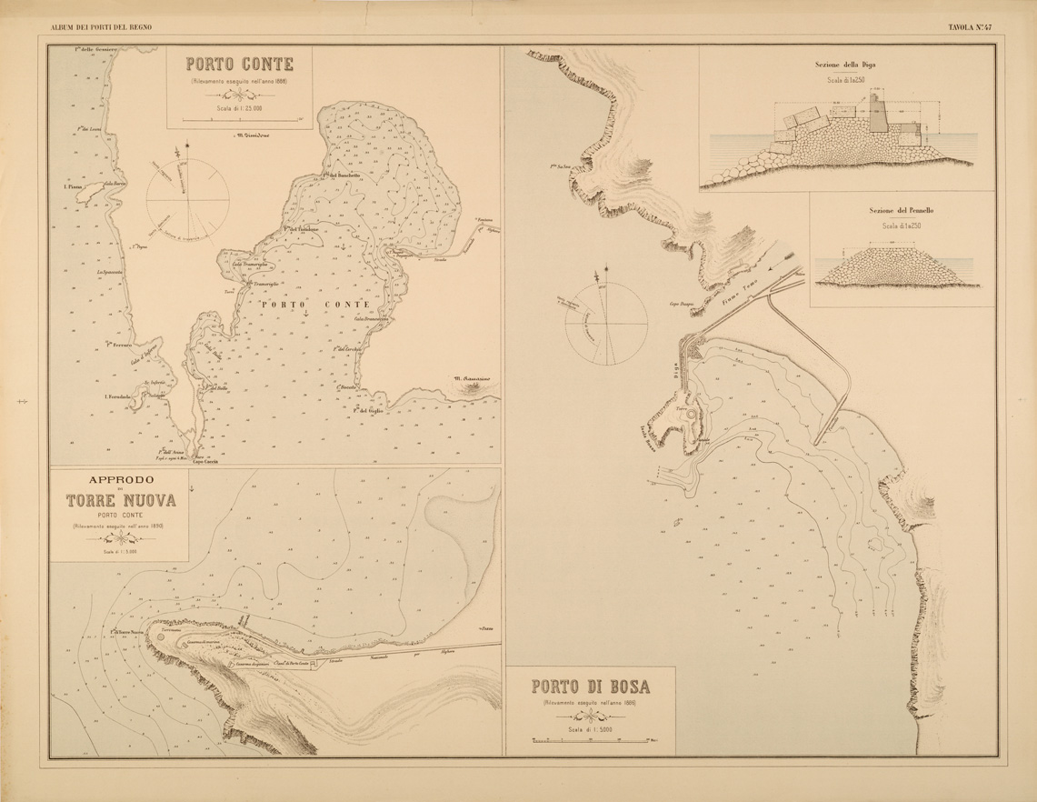 ALBUM DEI PORTI MARITTIMI DEL REGNO D'ITALIA - TAVOLA 47 - PORTI DI BOSA - PORTO CONTE - APPRODO DI TORRE NUOVA