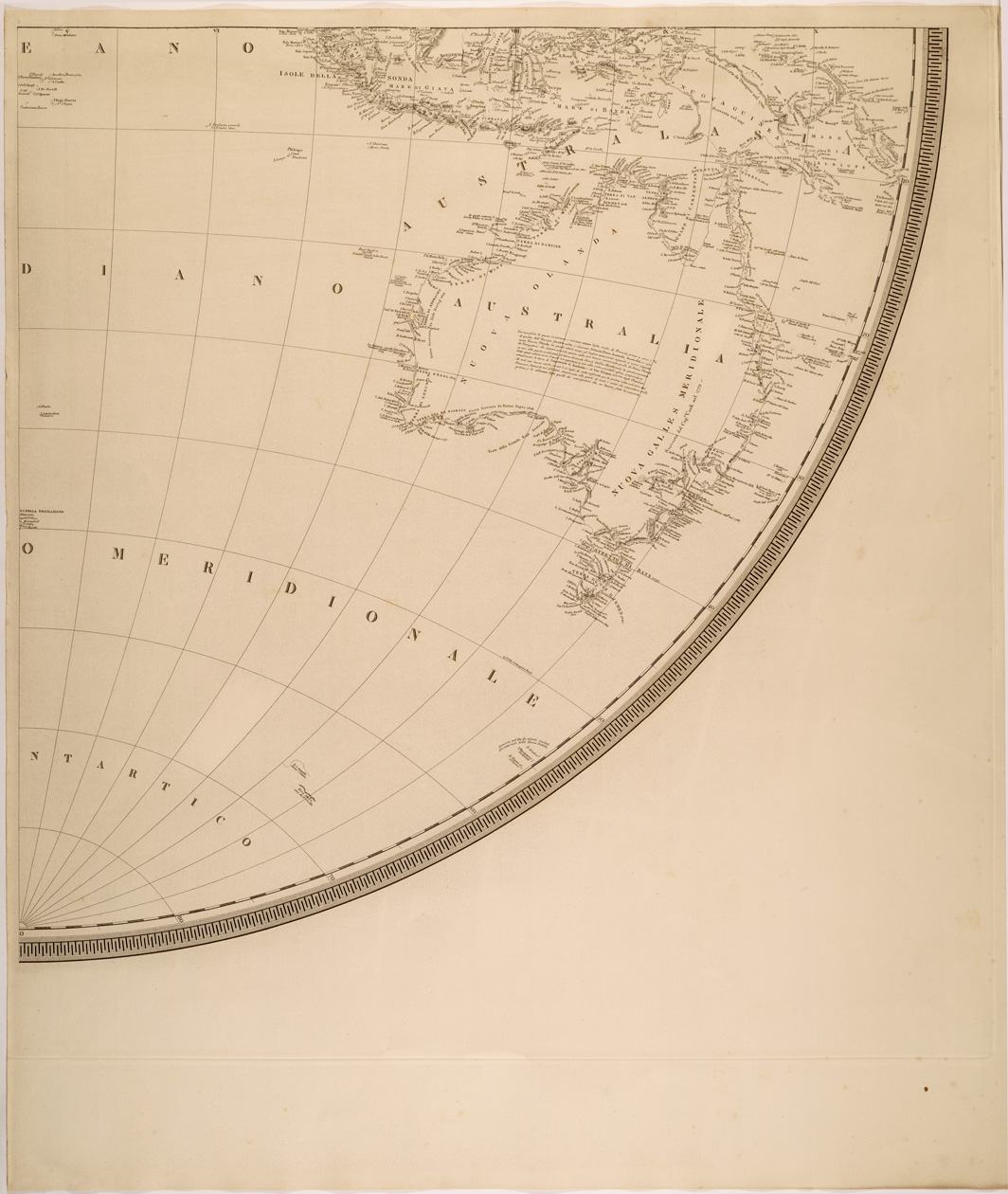 "Mappamondo realizzato da Raffaele Mancini, Ingegnere del Reale Ufficio Topografico di Napoli, costruito su quello del Barone Lord Alan Gardner, Ammiraglio dell' Armata Inglese e cartografo, e dedicato a Ferdinando II Re del Regno delle due Sicilie."