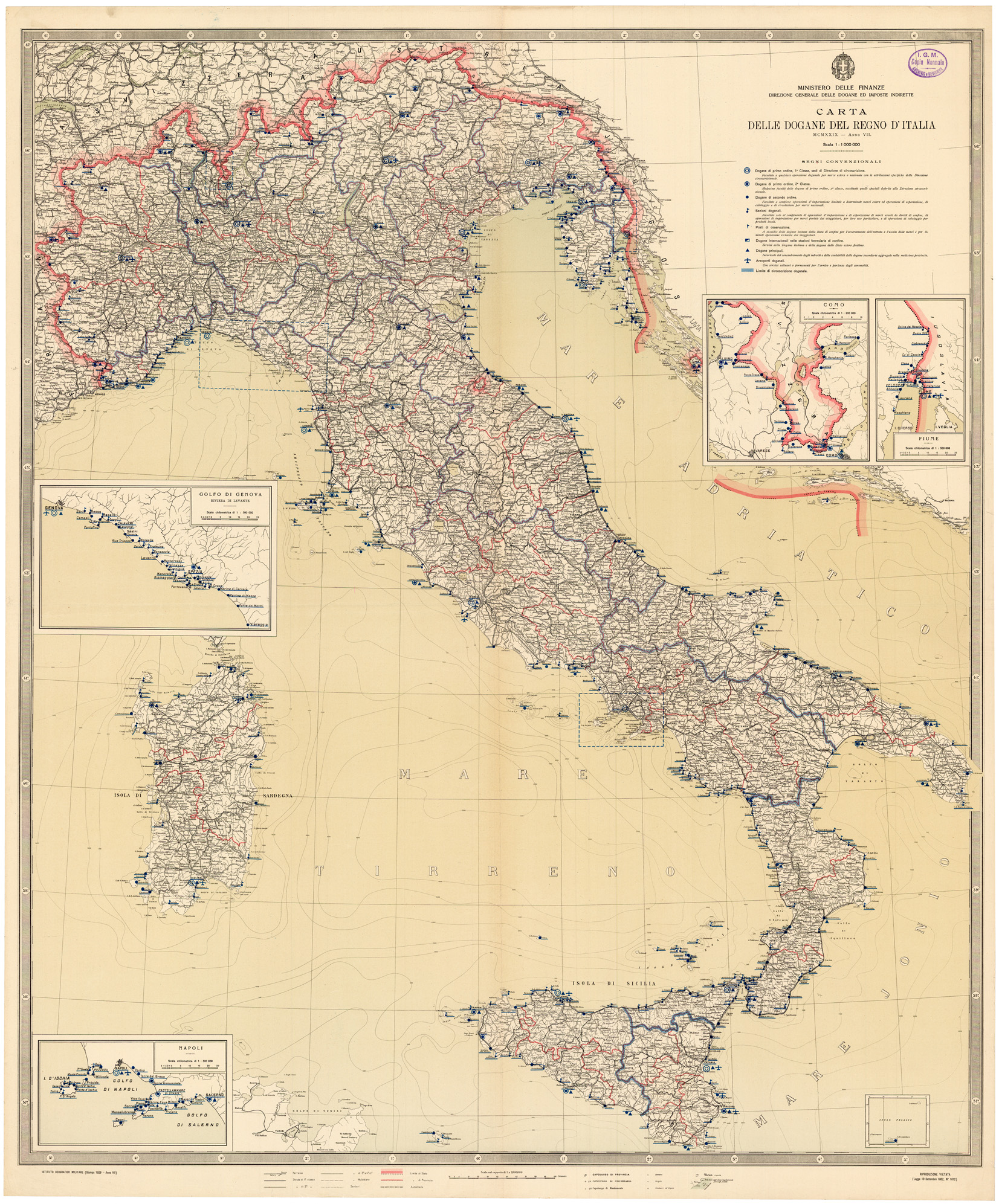 "Carta realizzata dall' IGM per la Direzione Generale delle Dogane ed Imposte Dirette del Ministero delle Finanze."