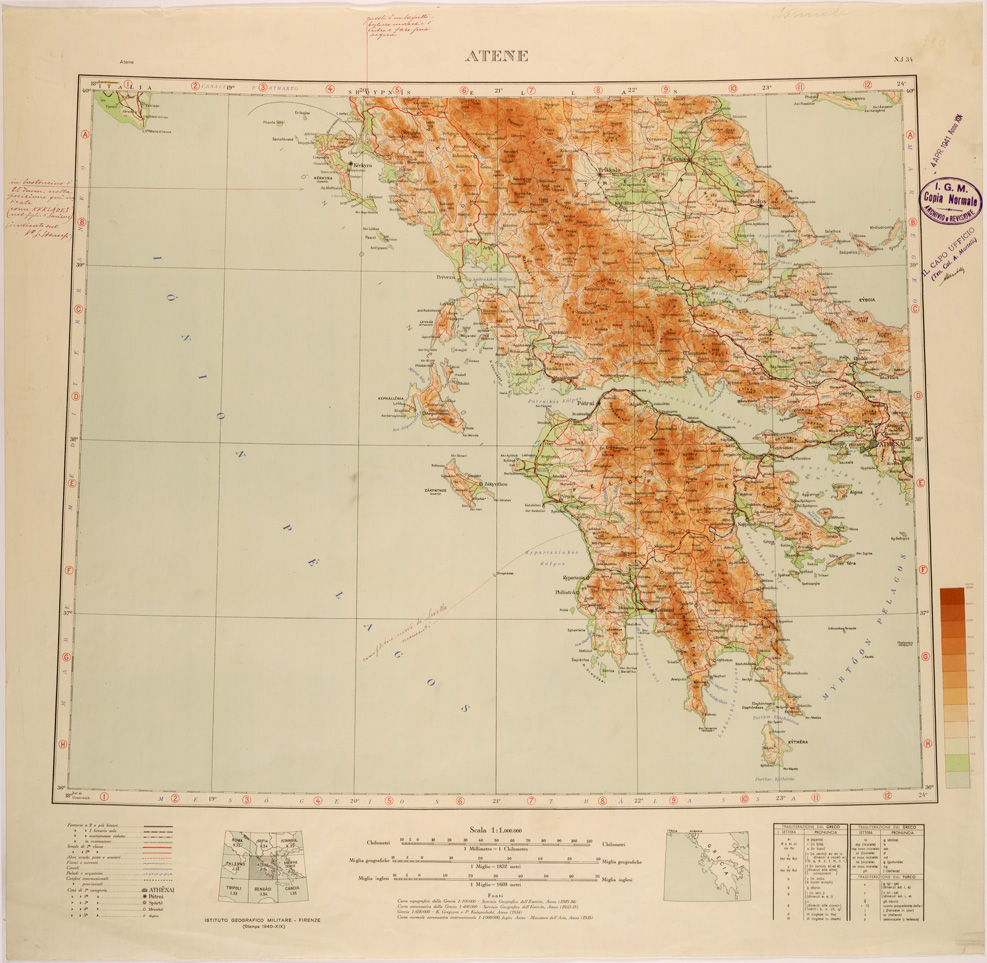 "Carta realizzata dalla Divisione Cartografica dell' IGM usando come fonti di compilazione la carta topografica della Grecia alla scala di 1:100.000 del 1925-1934 , la carta aeronautica della Grecia alla scala di 1:400.000 del 1933-1935 del Servizio Geografico dell' Esercito Greco, la carta normale aeronautica internazionale alla scala di 1:1.000.000 foglio di Atene del Ministero dell' Aria Greco e la carta della Grecia alla scala di 1:600.000 di K. Gregoyra e P. Kalaspothake del 1934"