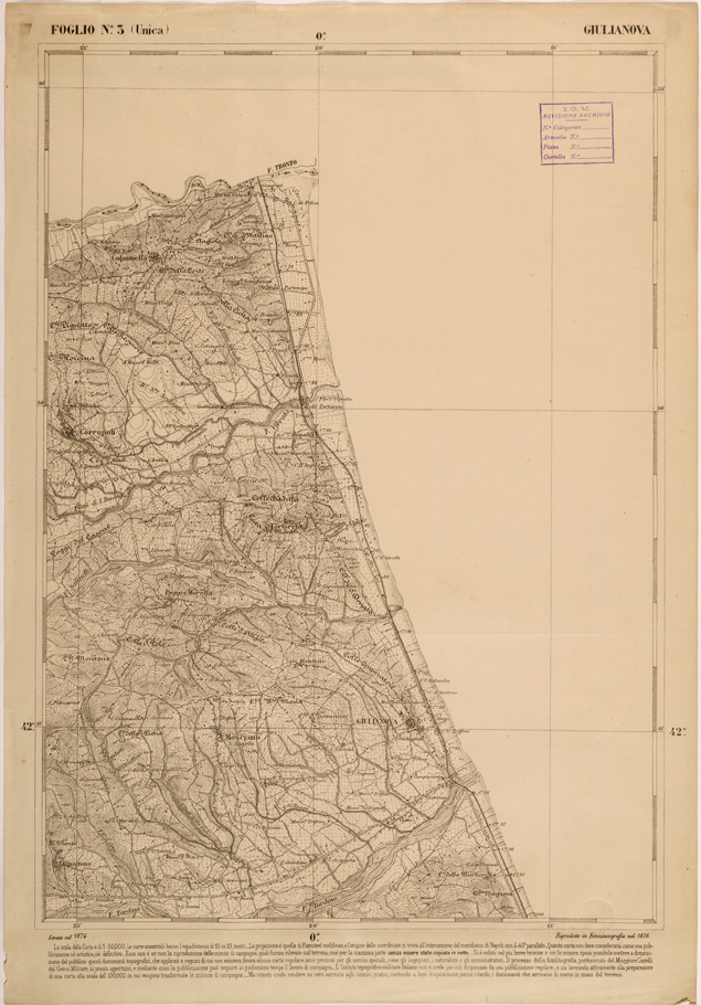 "Carta realizzata negli anni successivi all' unità d' Italia dall' appena istituito Ufficio Tecnico dello Stato Maggiore, poi divenuto Istituto Topografico Militare, attuale IGM, al fine di avere una copertura cartografica regolare di quelle regioni che ne erano sprovviste, nell' ottica di una successiva, generale unificazione cartografica nazionale."
