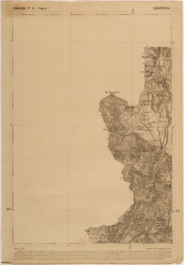 "Carta realizzata negli anni successivi all' unità d' Italia dall' appena istituito Ufficio Tecnico dello Stato Maggiore, poi divenuto Istituto Topografico Militare, attuale IGM, al fine di avere una copertura cartografica regolare di quelle regioni che ne erano sprovviste, nell' ottica di una successiva, generale unificazione cartografica nazionale."