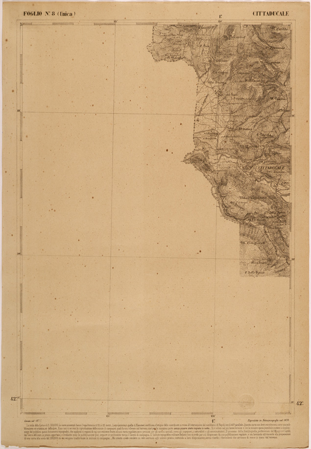 "Carta realizzata negli anni successivi all' unità d' Italia dall' appena istituito Ufficio Tecnico dello Stato Maggiore, poi divenuto Istituto Topografico Militare, attuale IGM, al fine di avere una copertura cartografica regolare di quelle regioni che ne erano sprovviste, nell' ottica di una successiva, generale unificazione cartografica nazionale."