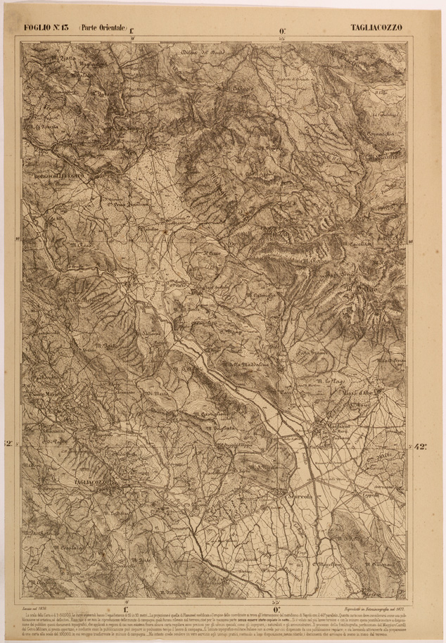 "Carta realizzata negli anni successivi all' unità d' Italia dall' appena istituito Ufficio Tecnico dello Stato Maggiore, poi divenuto Istituto Topografico Militare, attuale IGM, al fine di avere una copertura cartografica regolare di quelle regioni che ne erano sprovviste, nell' ottica di una successiva, generale unificazione cartografica nazionale."
