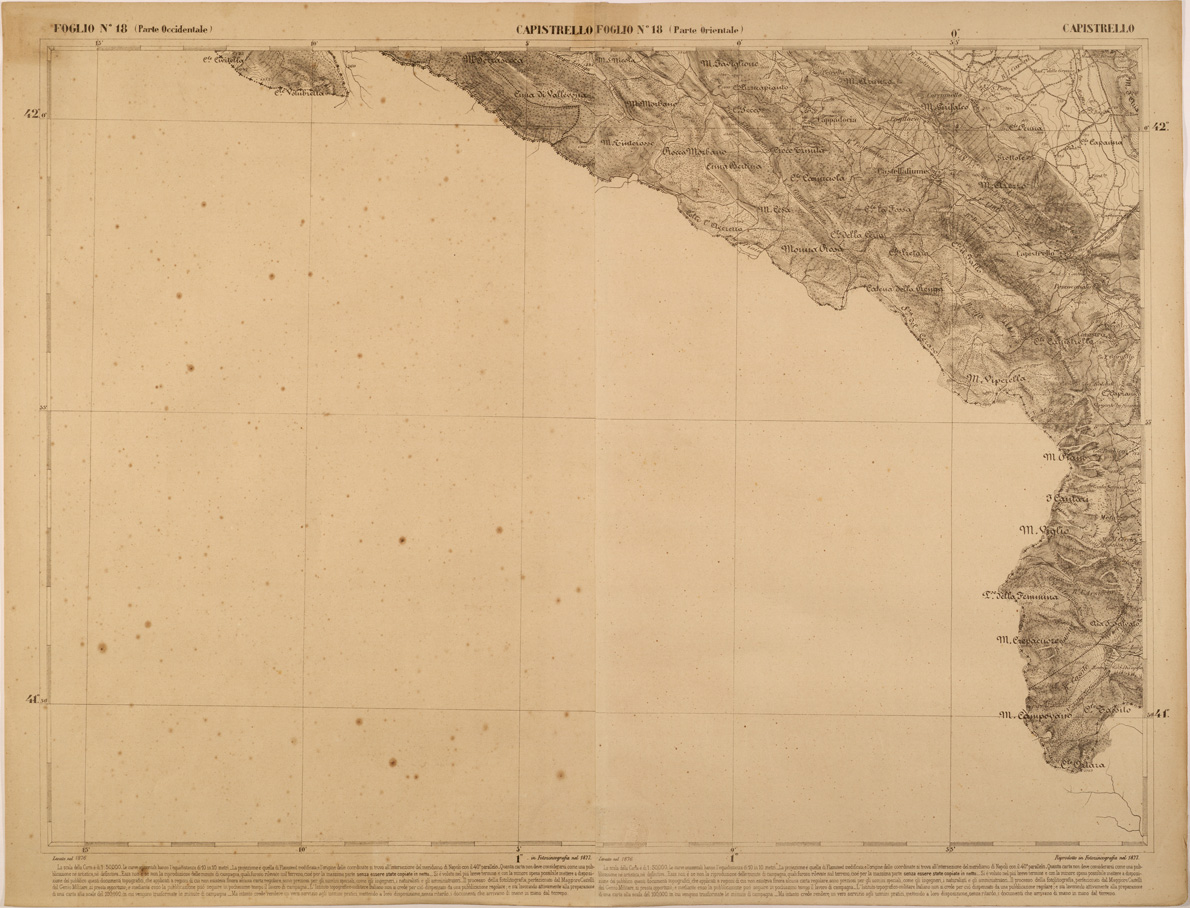 "Carta realizzata negli anni successivi all' unità d' Italia dall' appena istituito Ufficio Tecnico dello Stato Maggiore, poi divenuto Istituto Topografico Militare, attuale IGM, al fine di avere una copertura cartografica regolare di quelle regioni che ne erano sprovviste, nell' ottica di una successiva, generale unificazione cartografica nazionale."