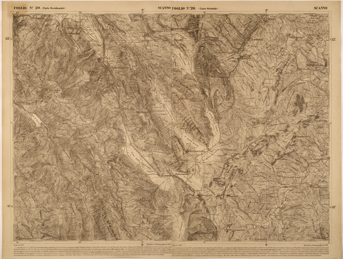 "Carta realizzata negli anni successivi all' unità d' Italia dall' appena istituito Ufficio Tecnico dello Stato Maggiore, poi divenuto Istituto Topografico Militare, attuale IGM, al fine di avere una copertura cartografica regolare di quelle regioni che ne erano sprovviste, nell' ottica di una successiva, generale unificazione cartografica nazionale."