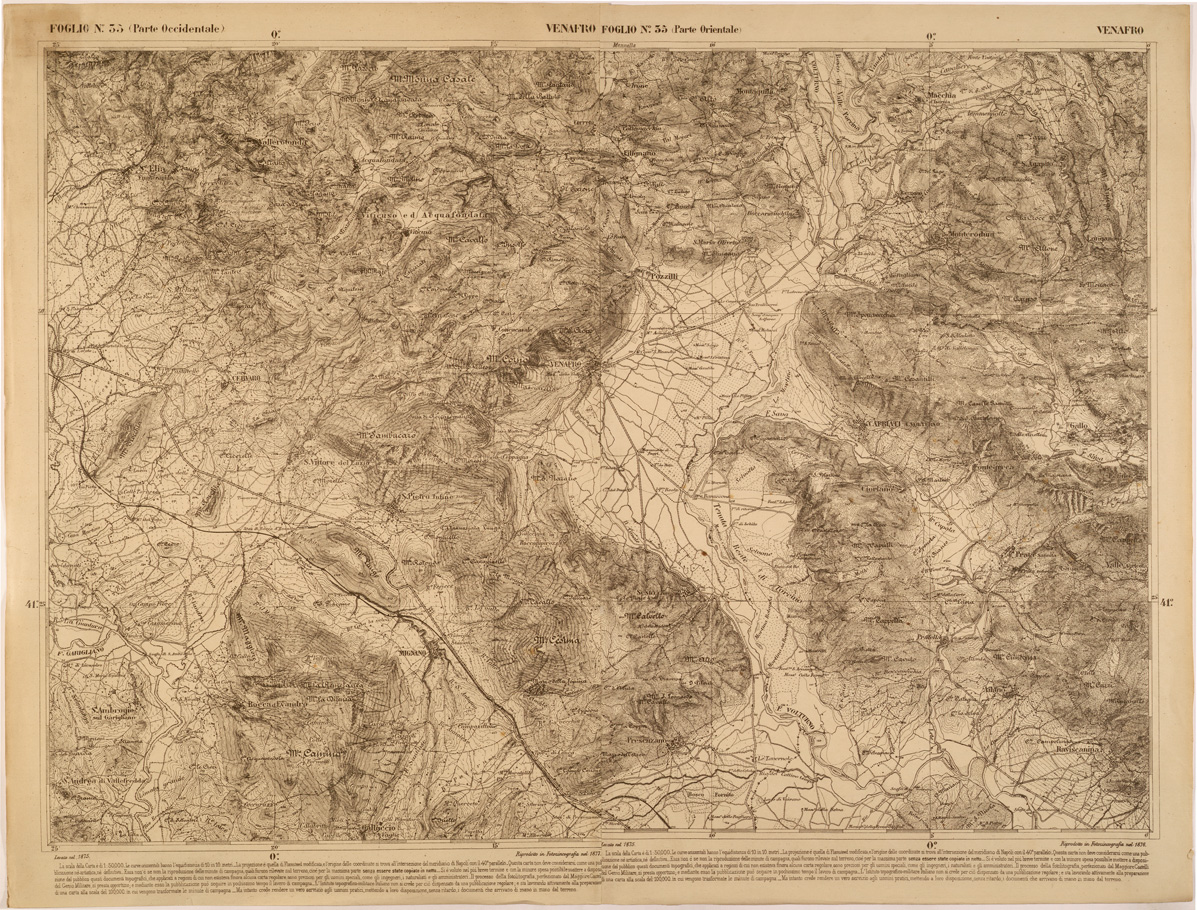 "Carta realizzata negli anni successivi all' unità d' Italia dall' appena istituito Ufficio Tecnico dello Stato Maggiore, poi divenuto Istituto Topografico Militare, attuale IGM, al fine di avere una copertura cartografica regolare di quelle regioni che ne erano sprovviste, nell' ottica di una successiva, generale unificazione cartografica nazionale."