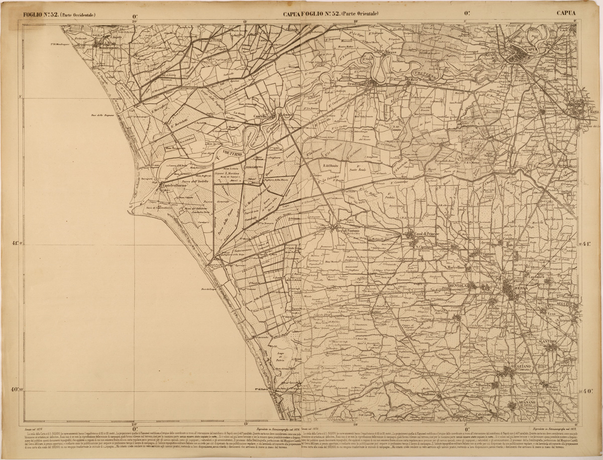 "Carta realizzata negli anni successivi all' unità d' Italia dall' appena istituito Ufficio Tecnico dello Stato Maggiore, poi divenuto Istituto Topografico Militare, attuale IGM, al fine di avere una copertura cartografica regolare di quelle regioni che ne erano sprovviste, nell' ottica di una successiva, generale unificazione cartografica nazionale."