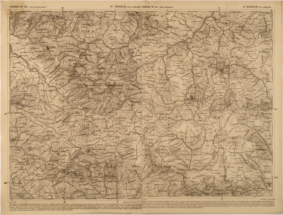 "Carta realizzata negli anni successivi all' unità d' Italia dall' appena istituito Ufficio Tecnico dello Stato Maggiore, poi divenuto Istituto Topografico Militare, attuale IGM, al fine di avere una copertura cartografica regolare di quelle regioni che ne erano sprovviste, nell' ottica di una successiva, generale unificazione cartografica nazionale."