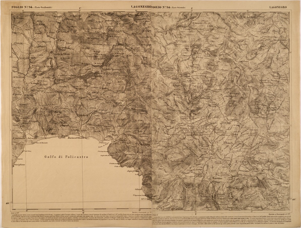 "Carta realizzata negli anni successivi all' unità d' Italia dall' appena istituito Ufficio Tecnico dello Stato Maggiore, poi divenuto Istituto Topografico Militare, attuale IGM, al fine di avere una copertura cartografica regolare di quelle regioni che ne erano sprovviste, nell' ottica di una successiva, generale unificazione cartografica nazionale."
