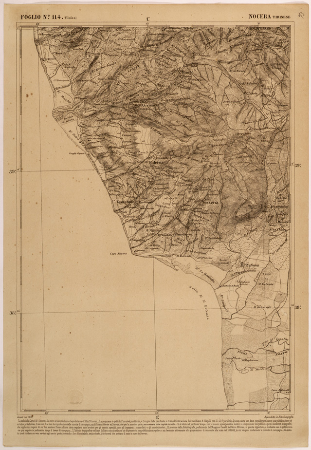 "Carta realizzata negli anni successivi all' unità d' Italia dall' appena istituito Ufficio Tecnico dello Stato Maggiore, poi divenuto Istituto Topografico Militare, attuale IGM, al fine di avere una copertura cartografica regolare di quelle regioni che ne erano sprovviste, nell' ottica di una successiva, generale unificazione cartografica nazionale."