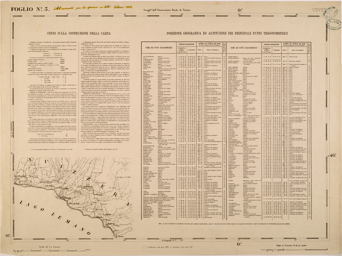 "FOGLIO 3 VEVEY CENNI SULLA COSTRUZIONE DELLA CARTA - La proiezione adottata è quella di Flamsteed modificata o di Bonne. Il centro del circolo meridiano stabilito nell' Osservatorio Reale di Torino fu scelto per origine delle coordinate o centro di sviluppamento. Latitudine e longitudine est di questo punto dal meridiano di Parigi,determinate astronomicamente, risultarono: 45°04'08",06 e 5°21'24",75. Elementi che servirono ai calcoli della proiezione furono:semiasse maggiore e minore della terra lunghezza della normale nel punto d'origine raggio del circolo osculatore al meridiano nel punto d'origine schiacciamento terrestre quadrato dell'eccentricità. La superficie fu divisa in quattro regioni corrispontenti al nord-est, sud-est, sud-ovest, nord-ovest comprendendo in complesso 90 fogli. "