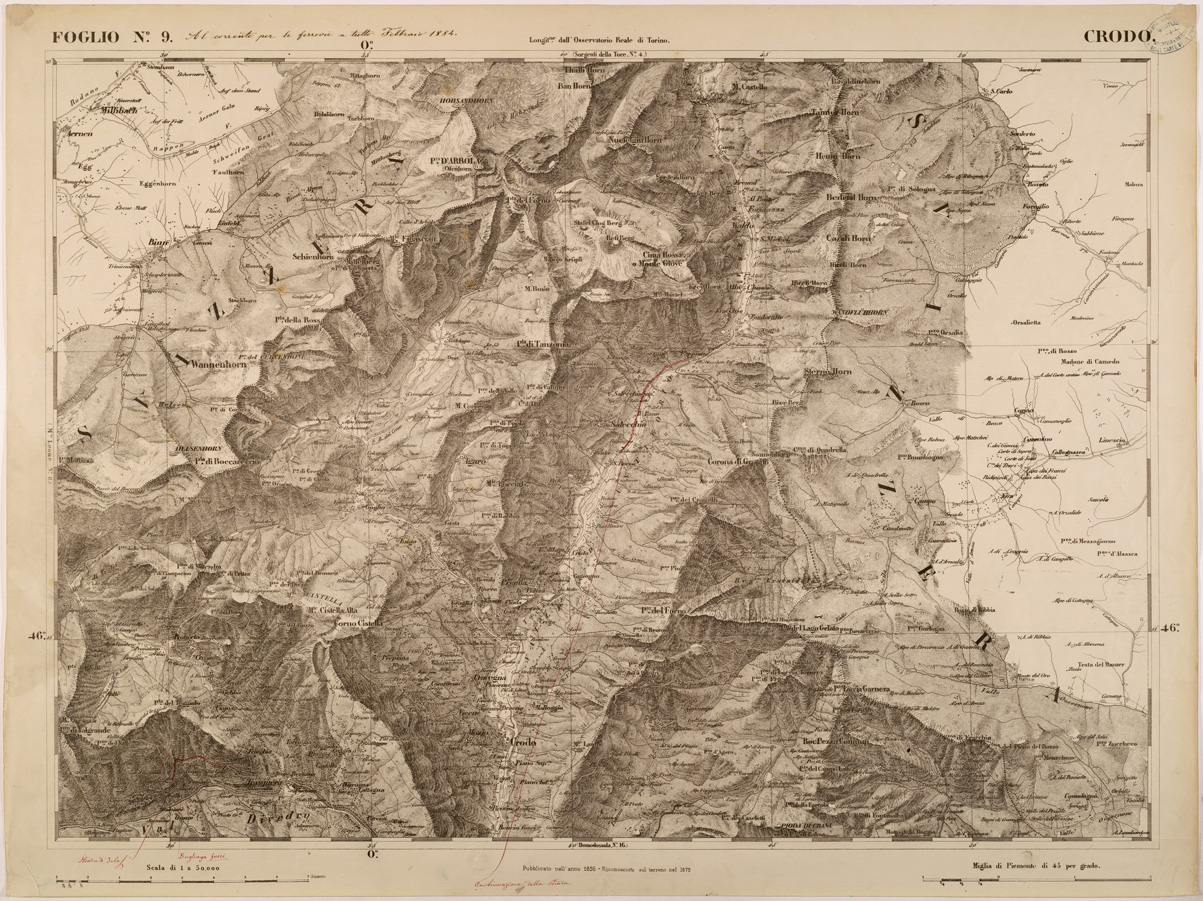 "FOGLIO 9 CRODO - La proiezione adottata è quella di Flamsteed modificata o di Bonne. Il centro del circolo meridiano stabilito nell' Osservatorio Reale di Torino fu scelto per origine delle coordinate o centro di sviluppamento. Latitudine e longitudine est di questo punto dal meridiano di Parigi,determinate astronomicamente, risultarono: 45°04'08",06 e 5°21'24",75. Elementi che servirono ai calcoli della proiezione furono:semiasse maggiore e minore della terra lunghezza della normale nel punto d'origine raggio del circolo osculatore al meridiano nel punto d'origine schiacciamento terrestre quadrato dell'eccentricità. La superficie fu divisa in quattro regioni corrispontenti al nord-est, sud-est, sud-ovest, nord-ovest comprendendo in complesso 90 fogli. "