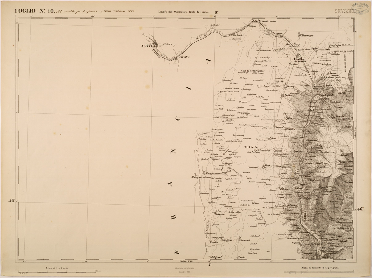 "FOGLIO 10 SEYSSEL - La proiezione adottata è quella di Flamsteed modificata o di Bonne. Il centro del circolo meridiano stabilito nell' Osservatorio Reale di Torino fu scelto per origine delle coordinate o centro di sviluppamento. Latitudine e longitudine est di questo punto dal meridiano di Parigi,determinate astronomicamente, risultarono: 45°04'08",06 e 5°21'24",75. Elementi che servirono ai calcoli della proiezione furono:semiasse maggiore e minore della terra lunghezza della normale nel punto d'origine raggio del circolo osculatore al meridiano nel punto d'origine schiacciamento terrestre quadrato dell'eccentricità. La superficie fu divisa in quattro regioni corrispontenti al nord-est, sud-est, sud-ovest, nord-ovest comprendendo in complesso 90 fogli. "