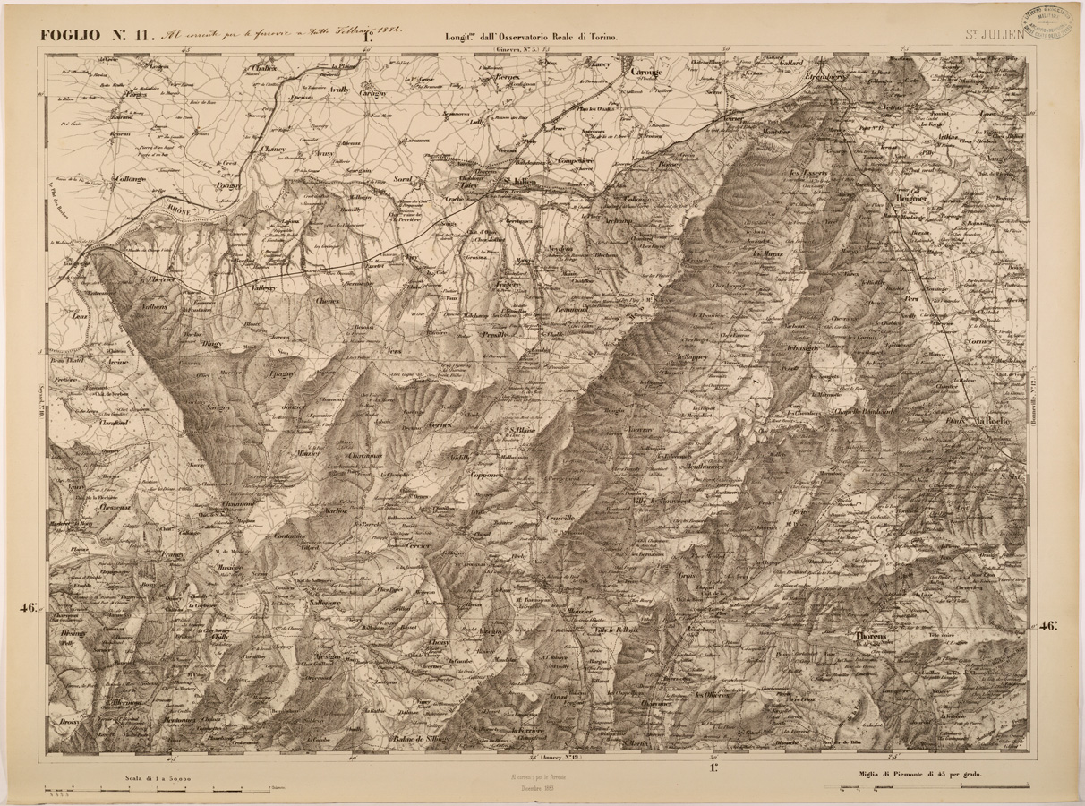 "FOGLIO 11 ST. JULIEN - La proiezione adottata è quella di Flamsteed modificata o di Bonne. Il centro del circolo meridiano stabilito nell' Osservatorio Reale di Torino fu scelto per origine delle coordinate o centro di sviluppamento. Latitudine e longitudine est di questo punto dal meridiano di Parigi,determinate astronomicamente, risultarono: 45°04'08",06 e 5°21'24",75. Elementi che servirono ai calcoli della proiezione furono:semiasse maggiore e minore della terra lunghezza della normale nel punto d'origine raggio del circolo osculatore al meridiano nel punto d'origine schiacciamento terrestre quadrato dell'eccentricità. La superficie fu divisa in quattro regioni corrispontenti al nord-est, sud-est, sud-ovest, nord-ovest comprendendo in complesso 90 fogli. "