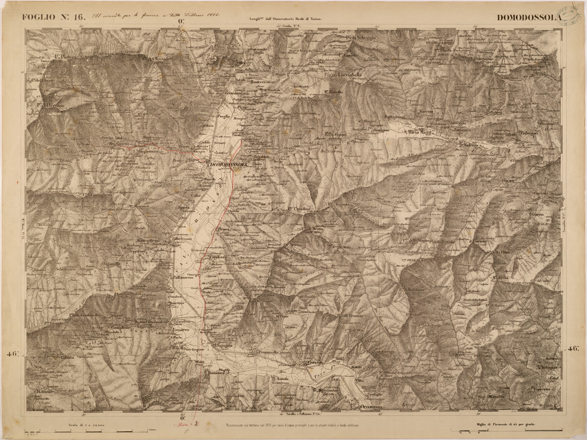 "FOGLIO 16 DOMODOSSOLA - La proiezione adottata è quella di Flamsteed modificata o di Bonne. Il centro del circolo meridiano stabilito nell' Osservatorio Reale di Torino fu scelto per origine delle coordinate o centro di sviluppamento. Latitudine e longitudine est di questo punto dal meridiano di Parigi,determinate astronomicamente, risultarono: 45°04'08",06 e 5°21'24",75. Elementi che servirono ai calcoli della proiezione furono:semiasse maggiore e minore della terra lunghezza della normale nel punto d'origine raggio del circolo osculatore al meridiano nel punto d'origine schiacciamento terrestre quadrato dell'eccentricità. La superficie fu divisa in quattro regioni corrispontenti al nord-est, sud-est, sud-ovest, nord-ovest comprendendo in complesso 90 fogli. "