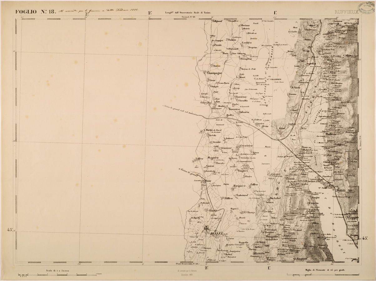 "FOGLIO 18 RUFFIEUX - La proiezione adottata è quella di Flamsteed modificata o di Bonne. Il centro del circolo meridiano stabilito nell' Osservatorio Reale di Torino fu scelto per origine delle coordinate o centro di sviluppamento. Latitudine e longitudine est di questo punto dal meridiano di Parigi,determinate astronomicamente, risultarono: 45°04'08",06 e 5°21'24",75. Elementi che servirono ai calcoli della proiezione furono:semiasse maggiore e minore della terra lunghezza della normale nel punto d'origine raggio del circolo osculatore al meridiano nel punto d'origine schiacciamento terrestre quadrato dell'eccentricità. La superficie fu divisa in quattro regioni corrispontenti al nord-est, sud-est, sud-ovest, nord-ovest comprendendo in complesso 90 fogli. "