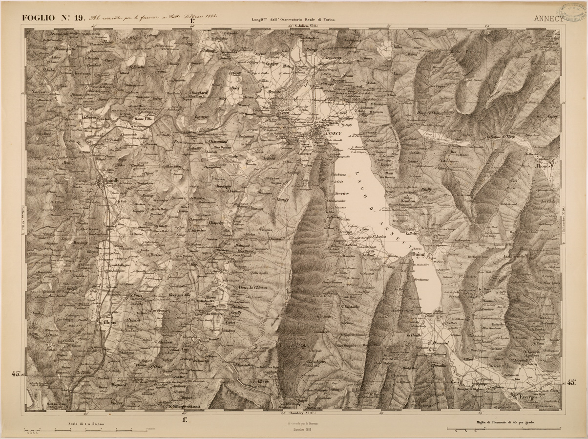 "FOGLIO 19 ANNECY - La proiezione adottata è quella di Flamsteed modificata o di Bonne. Il centro del circolo meridiano stabilito nell' Osservatorio Reale di Torino fu scelto per origine delle coordinate o centro di sviluppamento. Latitudine e longitudine est di questo punto dal meridiano di Parigi,determinate astronomicamente, risultarono: 45°04'08",06 e 5°21'24",75. Elementi che servirono ai calcoli della proiezione furono:semiasse maggiore e minore della terra lunghezza della normale nel punto d'origine raggio del circolo osculatore al meridiano nel punto d'origine schiacciamento terrestre quadrato dell'eccentricità. La superficie fu divisa in quattro regioni corrispontenti al nord-est, sud-est, sud-ovest, nord-ovest comprendendo in complesso 90 fogli. "