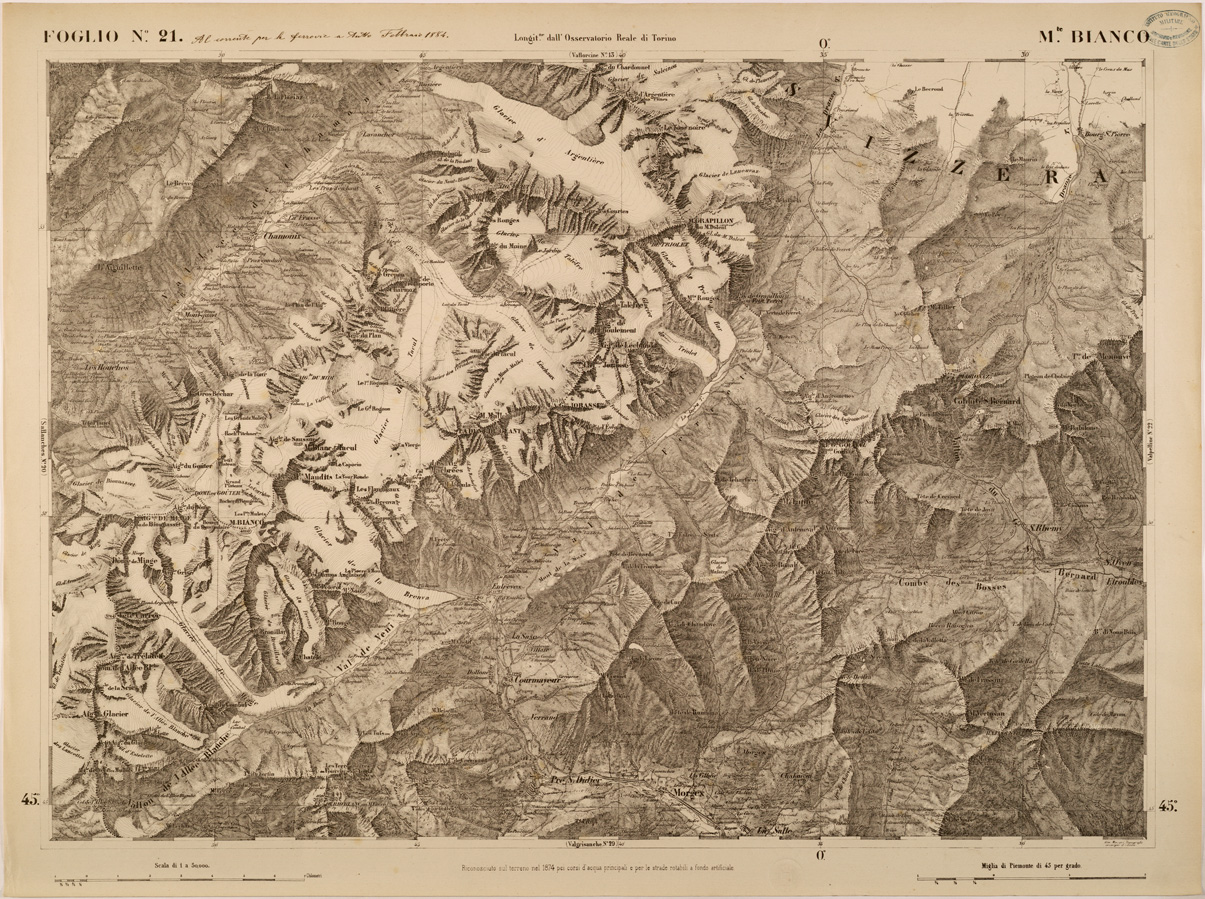 "FOGLIO 21 M.TE BIANCO - La proiezione adottata è quella di Flamsteed modificata o di Bonne. Il centro del circolo meridiano stabilito nell' Osservatorio Reale di Torino fu scelto per origine delle coordinate o centro di sviluppamento. Latitudine e longitudine est di questo punto dal meridiano di Parigi,determinate astronomicamente, risultarono: 45°04'08",06 e 5°21'24",75. Elementi che servirono ai calcoli della proiezione furono:semiasse maggiore e minore della terra lunghezza della normale nel punto d'origine raggio del circolo osculatore al meridiano nel punto d'origine schiacciamento terrestre quadrato dell'eccentricità. La superficie fu divisa in quattro regioni corrispontenti al nord-est, sud-est, sud-ovest, nord-ovest comprendendo in complesso 90 fogli. "